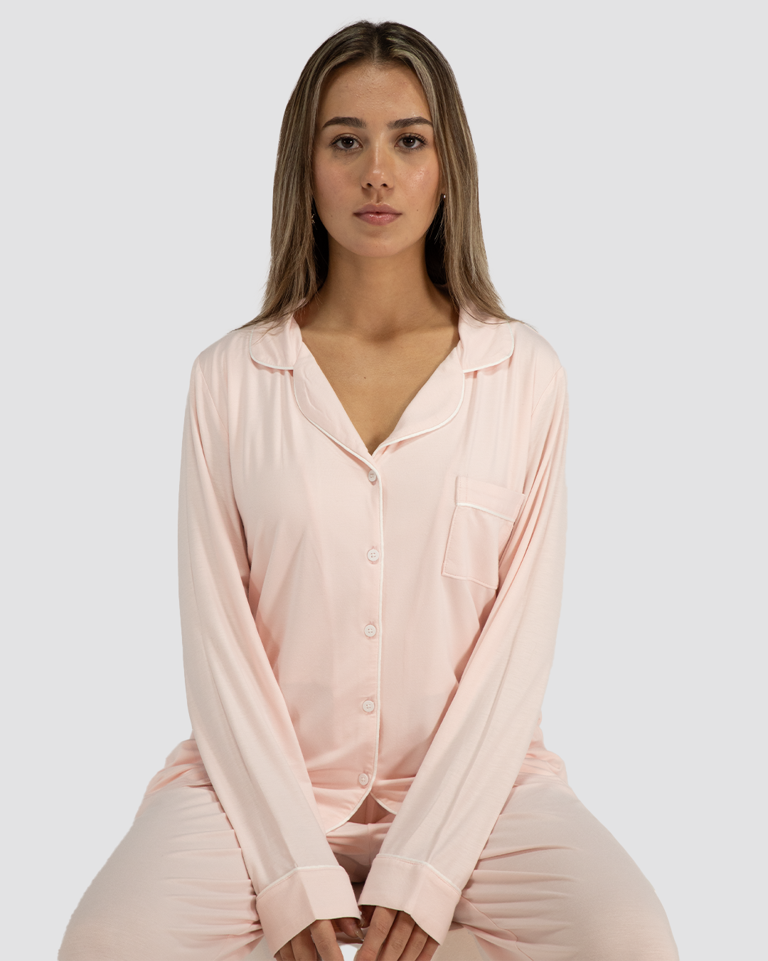 A timeless sleepwear classic. Featuring long sleeves, full-length pants with pockets, elegant white piping, and a button-down front. Perfect for lounging in comfort.
