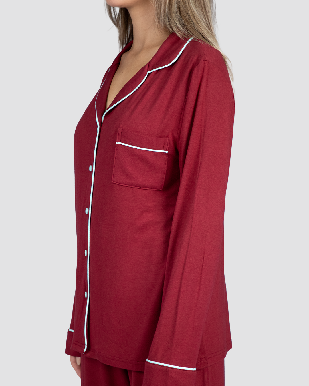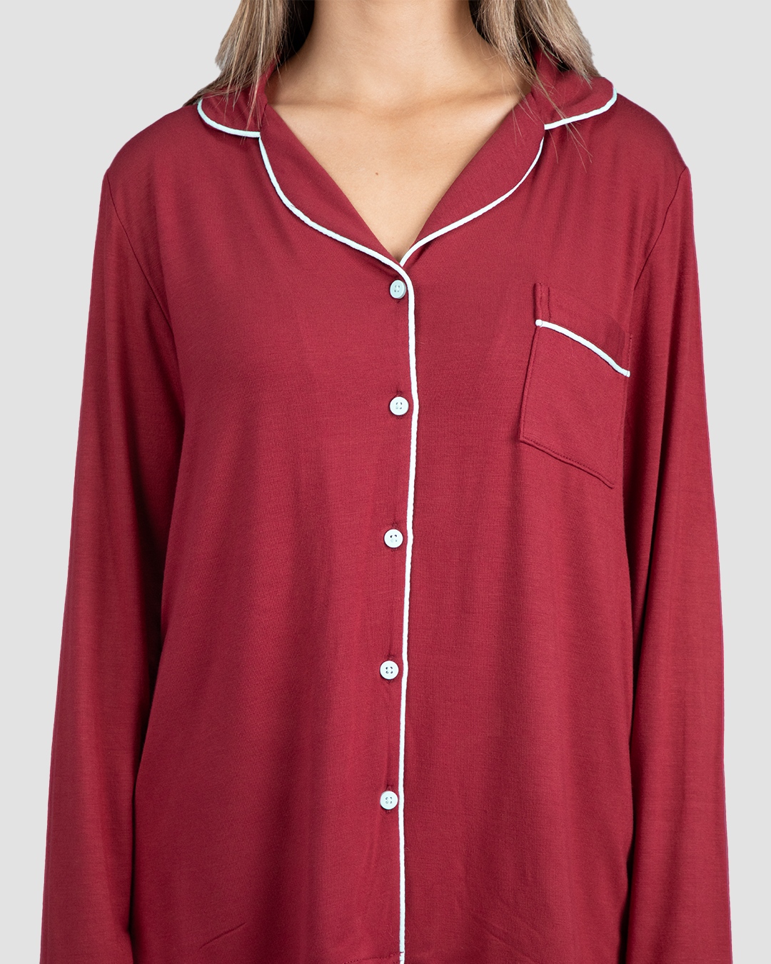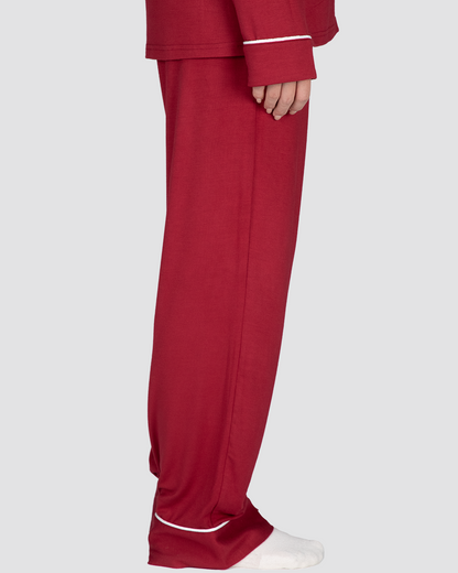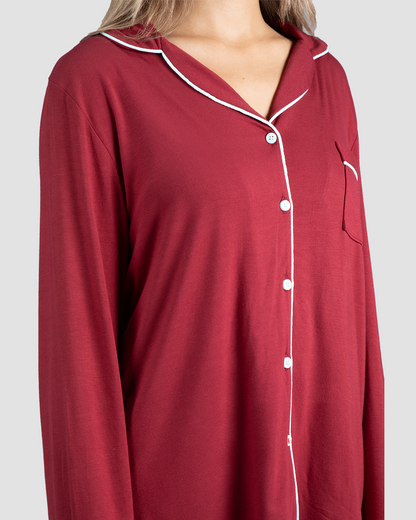 A timeless sleepwear classic. Featuring long sleeves, full-length pants with pockets, elegant white piping, and a button-down front. Perfect for lounging in comfort.