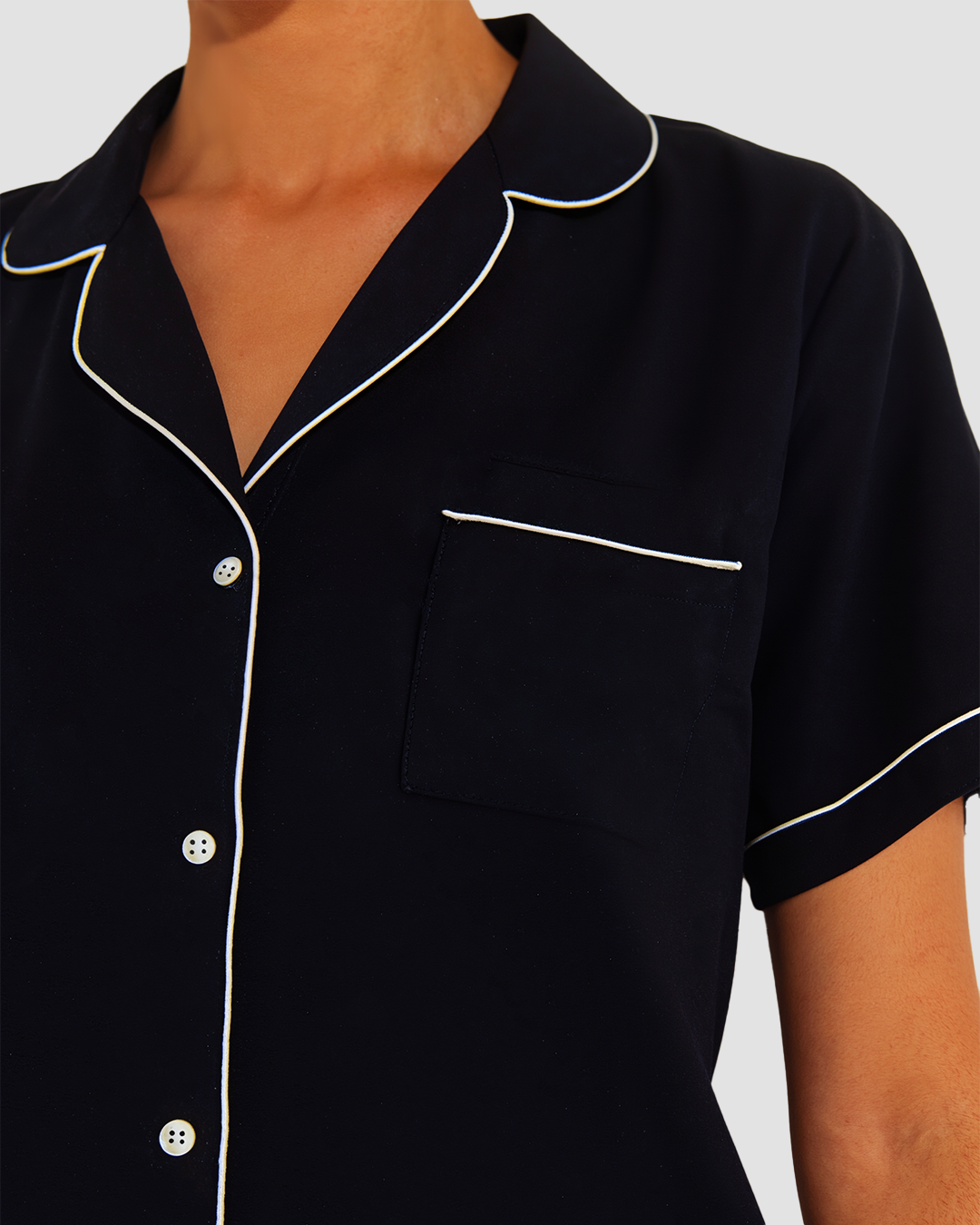 This set combines short sleeves with long pants and pockets, white piping, and a button-down front. Perfect for those who want to lounge in quiet luxury.